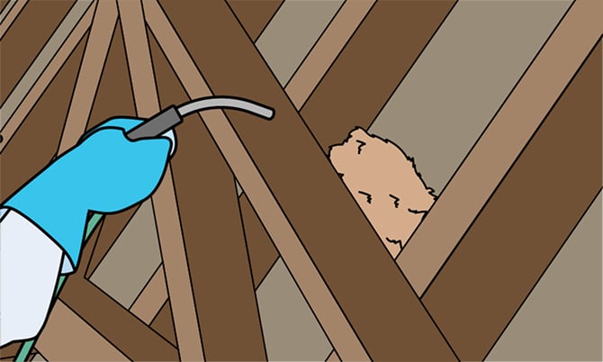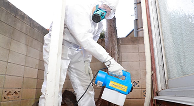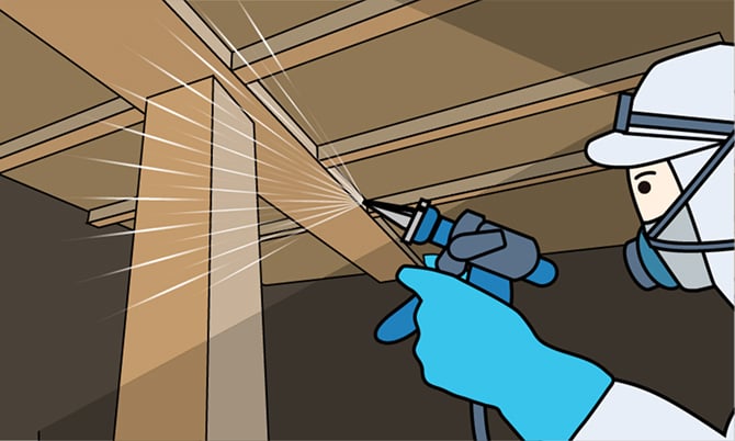 病原体や臭気の除去には塩化ベンザルコニウムなどを噴霧して殺菌と消臭を行います。また、糞尿によって天井裏などの木部に腐りが発生する場合は、対処施工として防腐剤の塗布・散布を行い処置を行います。